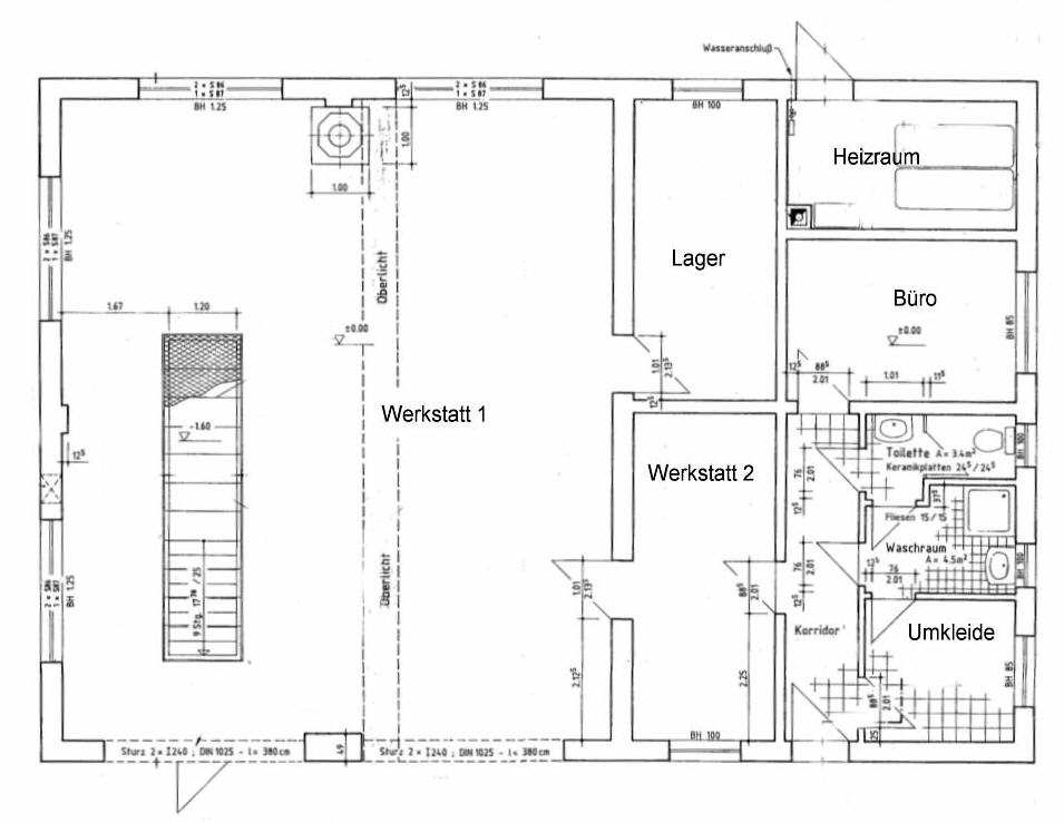- Werkhalle: L= 9,8m, B= 12m, H= 6m mit Arbeitsgrube und Säulenschwenkkran