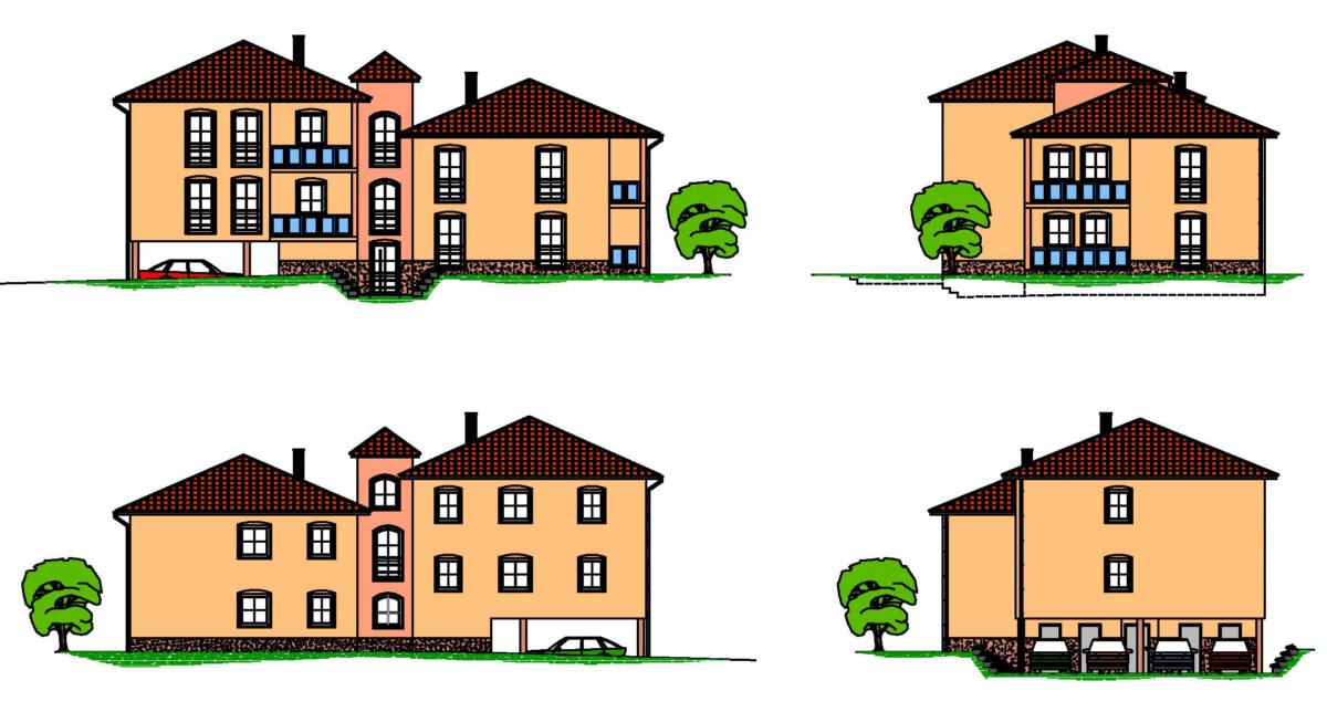 verbundenes Doppelwohnhaus mit offenen Tiefgaragen im mediterranem Stil